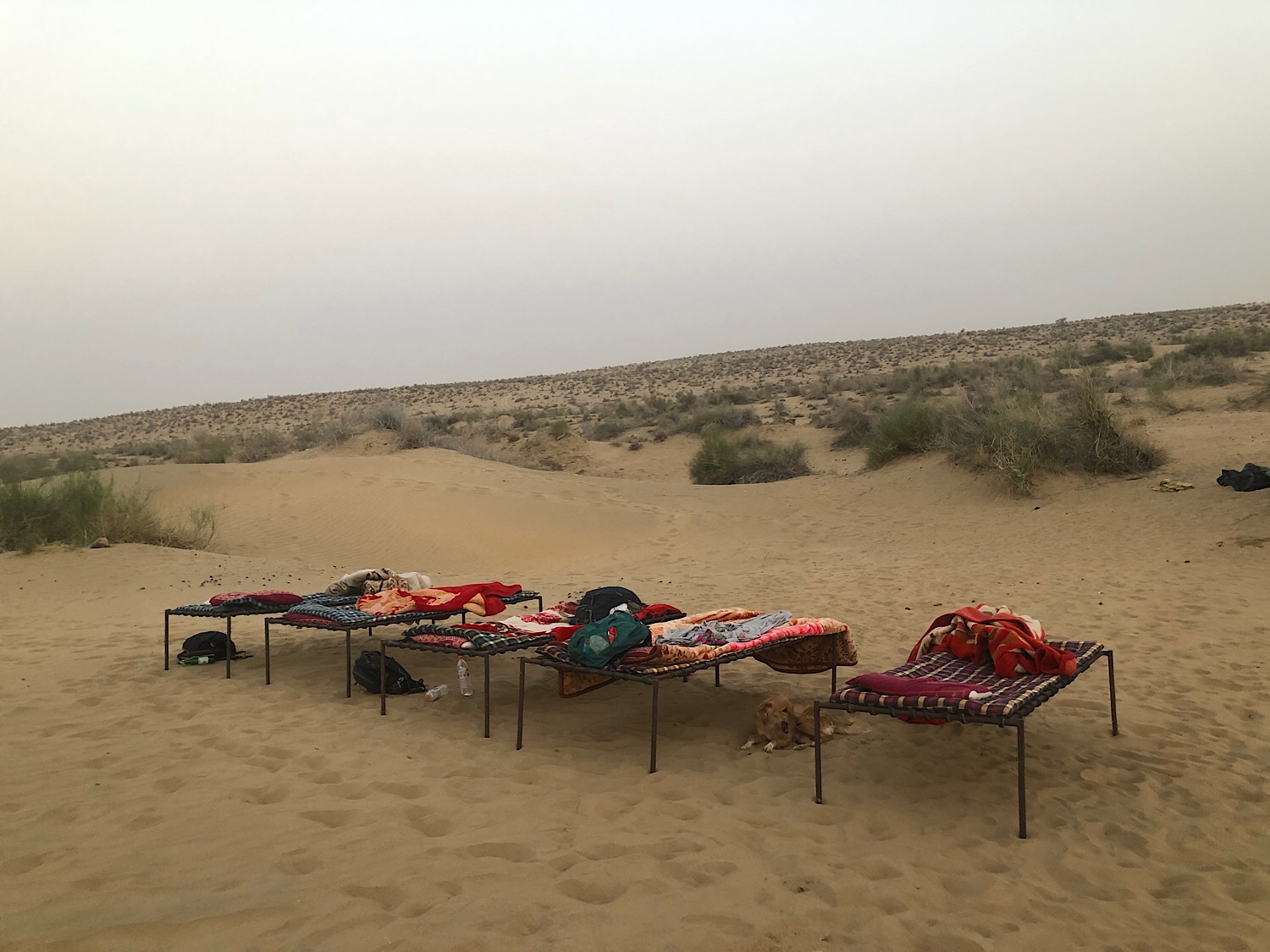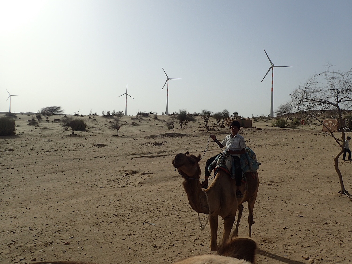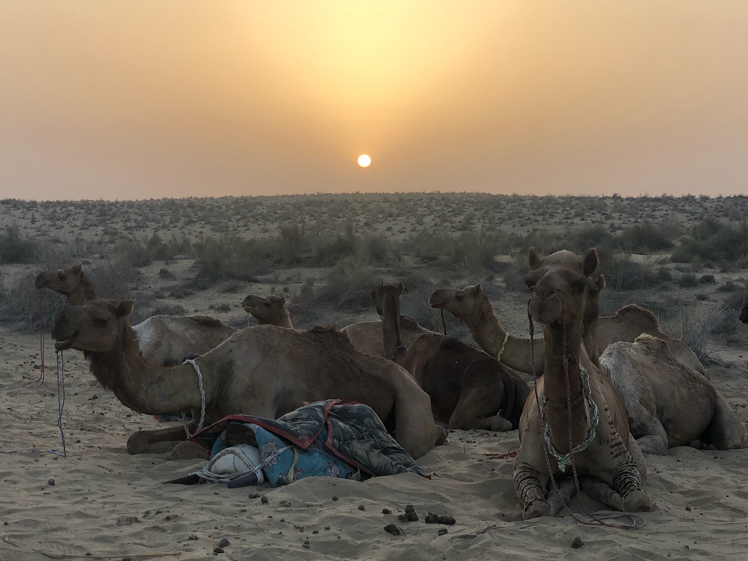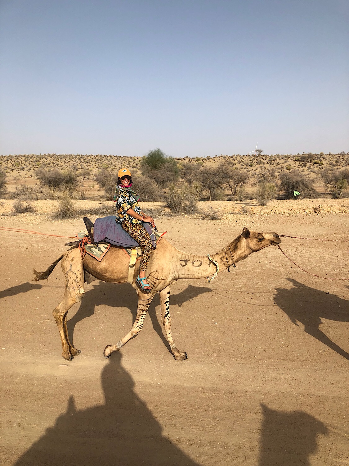 The unquestionable highlight of Jaisalmer (just edging ahead of when Fred had all his hair shaved off by Raj – see picture) was our overnight camel trek in the Thar desert. We drove out into the middle of nowhere in a jeep where we met our guides and camels, I was assigned Jony and Fred was riding Al Pacino (lols). Once we were acquainted, we plodded across the desert through fields of wind turbines (which was odd but also cool) for a couple of hours passing only a handful of goats, some cacti and the occasional shrub. When we reached a lovely spot in the dunes we dismounted and set up camp for the night. There were some metal frame camp beds and blankets and that was our bedroom for the night – under the stars in the desert. Our guide and his assistants cooked up a delicious and hearty dinner on the open fire of daal, veg curry, popadoms and rice which we scoffed down followed by some nicely chilled beers (ok so it wasn’t Bear Grylls level of wilderness – but it was exciting nonetheless). After watching the sun go down on the desert we sat around the fire chatting before turning in. The adventure was made even better due the lovely Dutch couple Rob and Tosca who were also on the trip and who introduced us to the concept of self drive and sleeping on top of your car in Africa (more about that in following posts). It was so surreal and exciting to be in the open desert lying under a sky filled with stars that I was too excited to sleep for the first few hours, we lay there watching the sky and spotting an unbelievable number of shooting stars. I also had one of the desert dogs, a lovely little pup come and keep me company, snuggling down into the sand between mine and Fred’s beds. Although the majority of western tourists that make it to Jaisalmer probably do the overnight camel safari it was truly an awesome and incredibly unique adventure that left us both buzzing!!!! The next morning we watched the sunrise with a cup of chai before a great breakfast (that included maggi instant noodles – which I was totally fine with). Overnight they loosely tie the camel’s front legs together, which feels a bit cruel, then let them roam free whilst we were sleeping, tying their legs together means they shouldn’t roam too far, in theory. However when we were almost ready to leave plucky Rob volunteered to go with some of the young camel herders to round them up. They were gone rather a long time and it turned out they had actually roamed an awful lot further than they usually would meaning it was a long old sweaty walk for Rob! Once they’d returned we boarded our trusty steeds and headed back to where the jeep would pick us up. We also got the chance to get the camels ‘trotting’ which was bloody bumpy and hilarious.