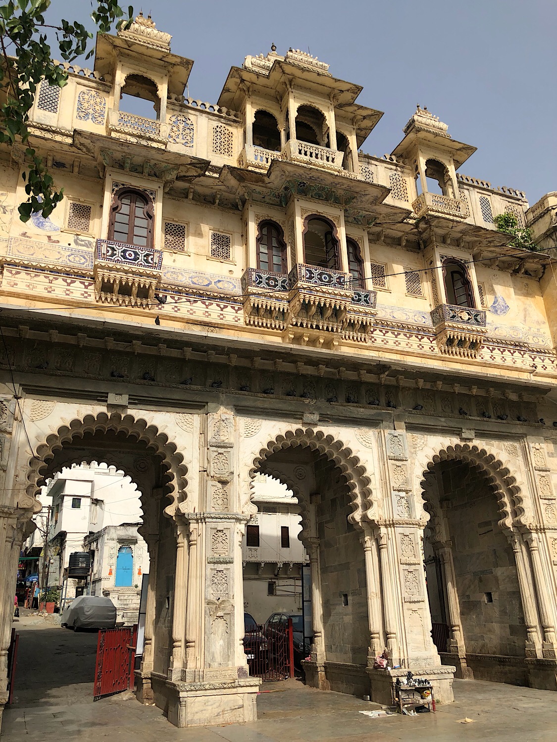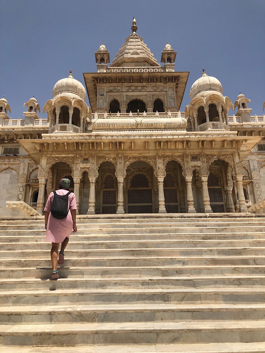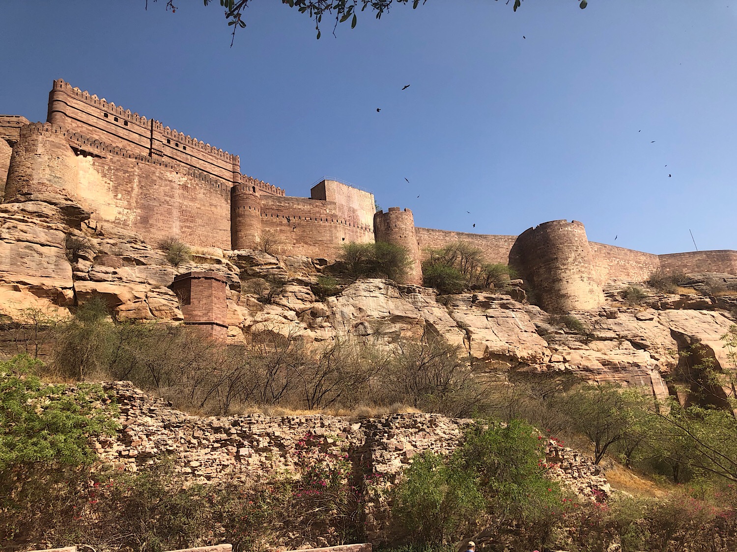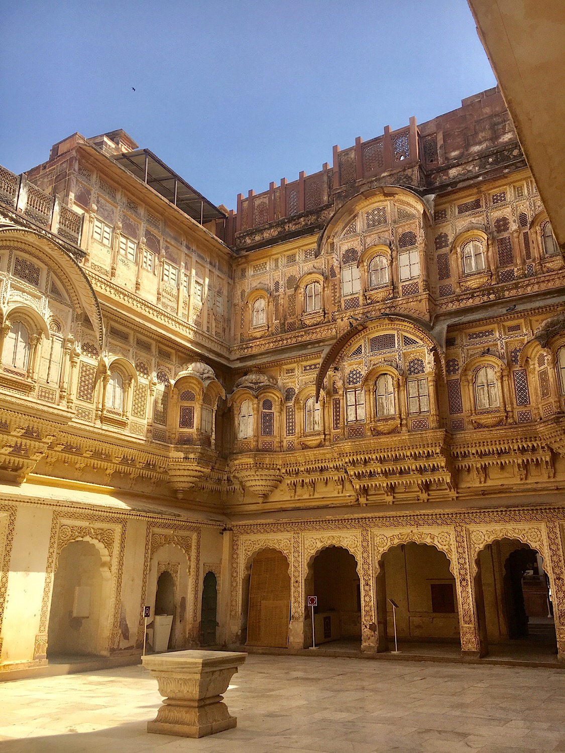 Another day another epic fort that was preceded by a visit to the royal mausoleum which was far more peaceful and beautiful than you might expect, all white marble and luscious green gardens. The fort in Jodphur is particularly imposing since the walls are insurmountably tall – 40 metres in some places, with the huge wooden gates we were used to seeing adorned with menacing metal spikes to deter enemy elephants from smashing them down. Swarms of eagles soar over the palace making it feel very medieval, it also didn’t disappoint in terms of the totally extra and opulent courtyards, mirrored pleasure rooms, stained glass windows and extravagant baby cradles for the royal squirts.