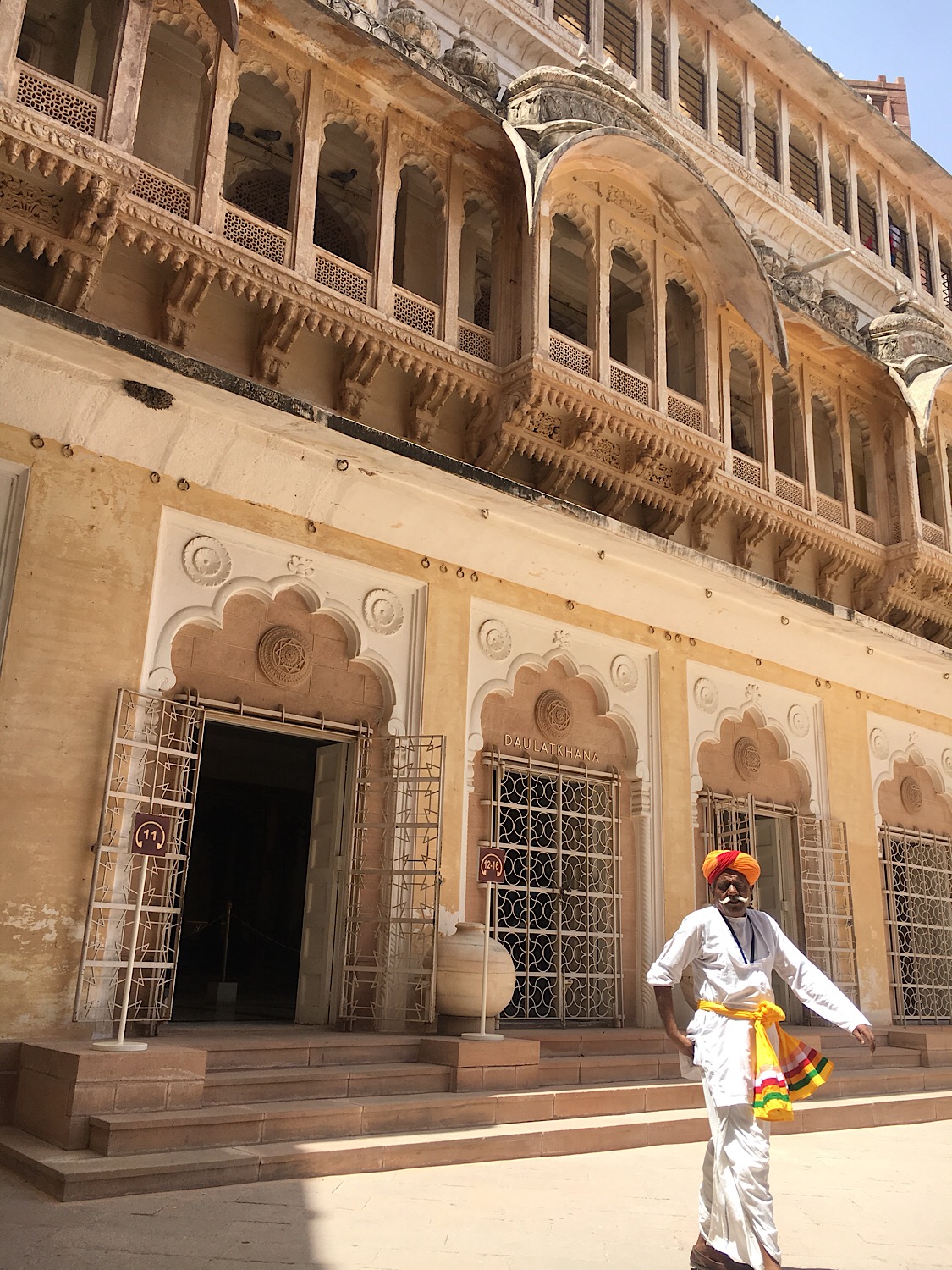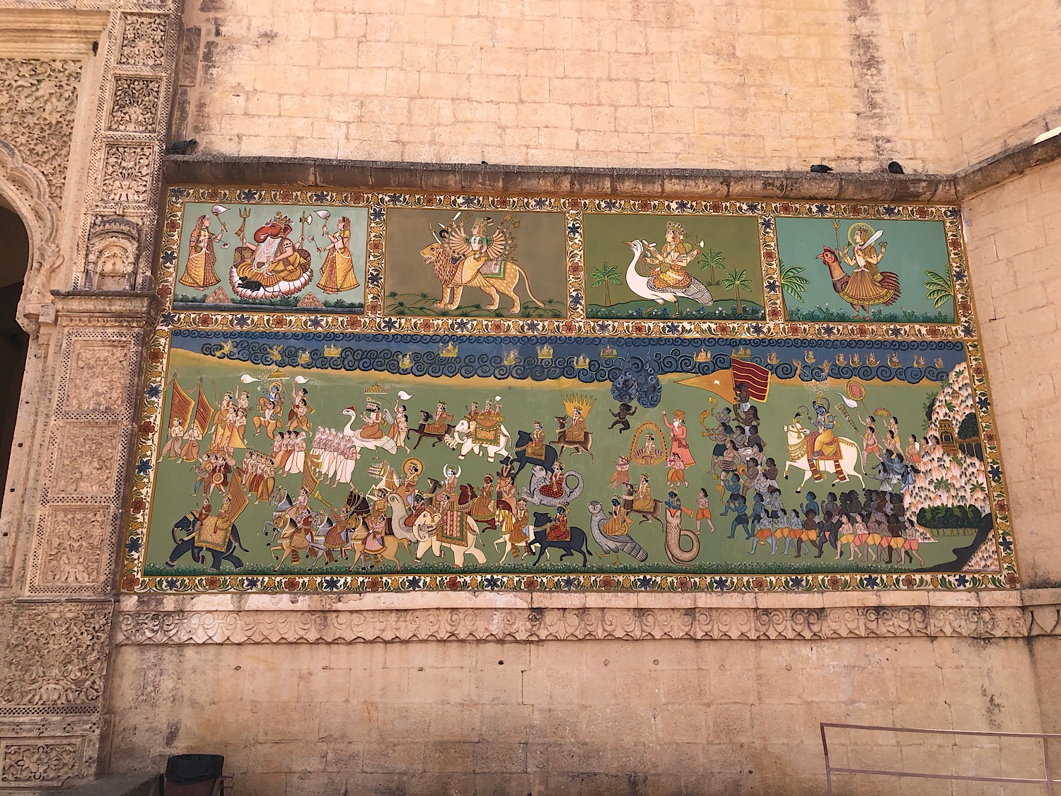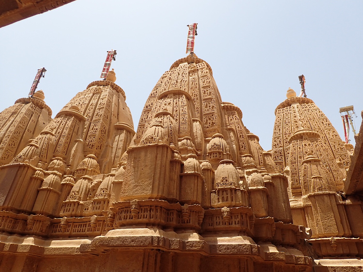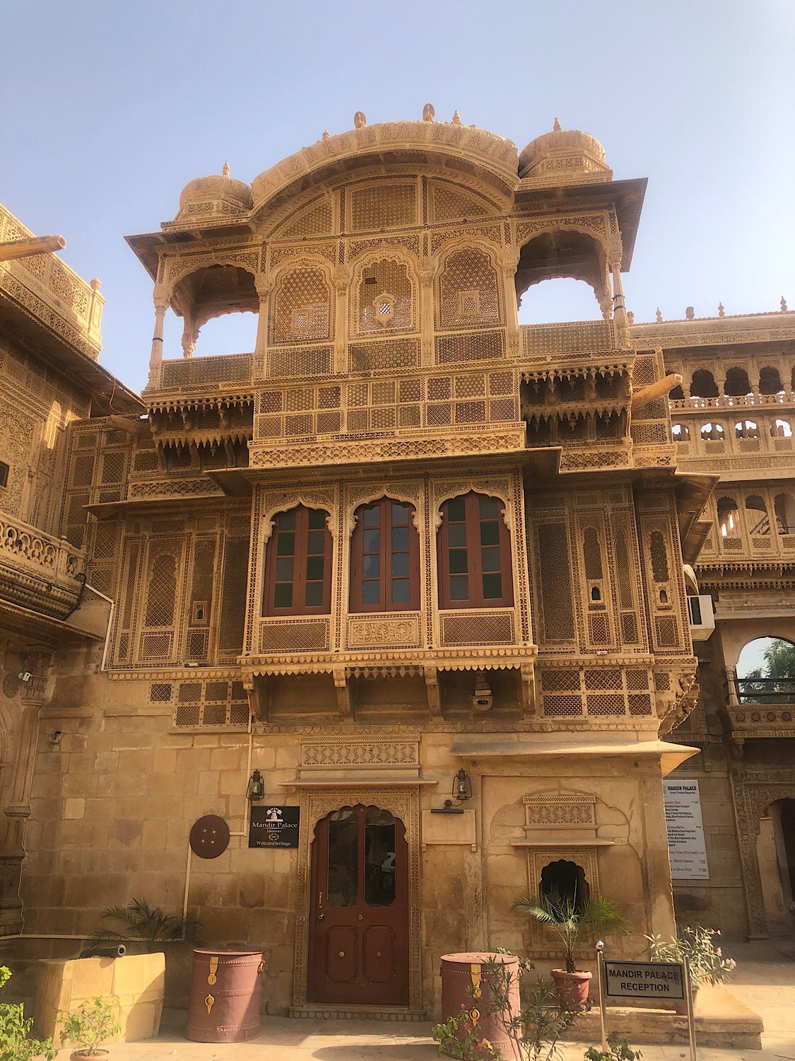 The fort itself is the largest and oldest ‘living’ fort in the world with around 4000 people living within its walls and, although the modern conveniences of running water aren’t doing wonders for the sandstone structure, it is still majorly impressive. The imposing fort walls and 99 ramparts (they’ve 99 problems but ramparts ain’t one) are only broken by the huge wooden gates and within the fort there’s a super juxtaposition of modern commerce – ice cream parlours, tourist tat shops and restaurants against the royal palace buildings that are adorned with extremely intricate stone carved screens and walls that, at first glance, appear to be wood given how detailed they are. Another fantastic audio guide taught us all about the ritual of Suthi where the women and girls of the royal family would dress up in all their finery and throw themselves on a burning funeral pyre if their men died in battle – hectic. We also visited a spectacular Jain temple a complex of three of four Temple all carved out of sandstone and connected but courtyards and walkways. Pretty much every surface is covered in intricate carvings of gods, goddesses, deities and demons. Apparently the traders were historically very wealthy and clearly this entrepreneurial streak still rings true with the modern Jain holy men since we paid to enter the temple then also had to pay the multiple guides who helpfully showed us around and imparted their wisdom plus leave a donation before we left!