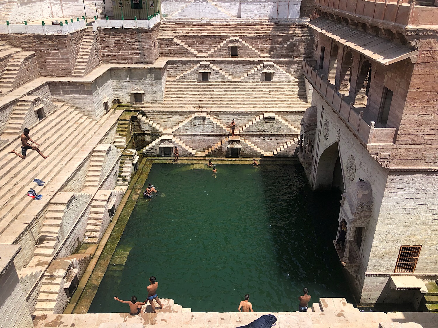 After a good night’s sleep we set off to explore the city, right next to our hotel there was a wonderful and recently restored Stepwell which is a huge water tank right in the city with stone steps leading into its deep aquamarine waters. It was magical and unlike nothing either of us had seen the only thing I could compare it to is a cenote, the huge natural sinkholes you find in Mexico that the aztecs used to launch various human and animal sacrifices into. There was a gaggle of local boys plunging into the pool from various daring heights, much to our and other onlookers delight and horror. The water did look pretty tempting given the heat but ingesting any of that water would not have ended well.