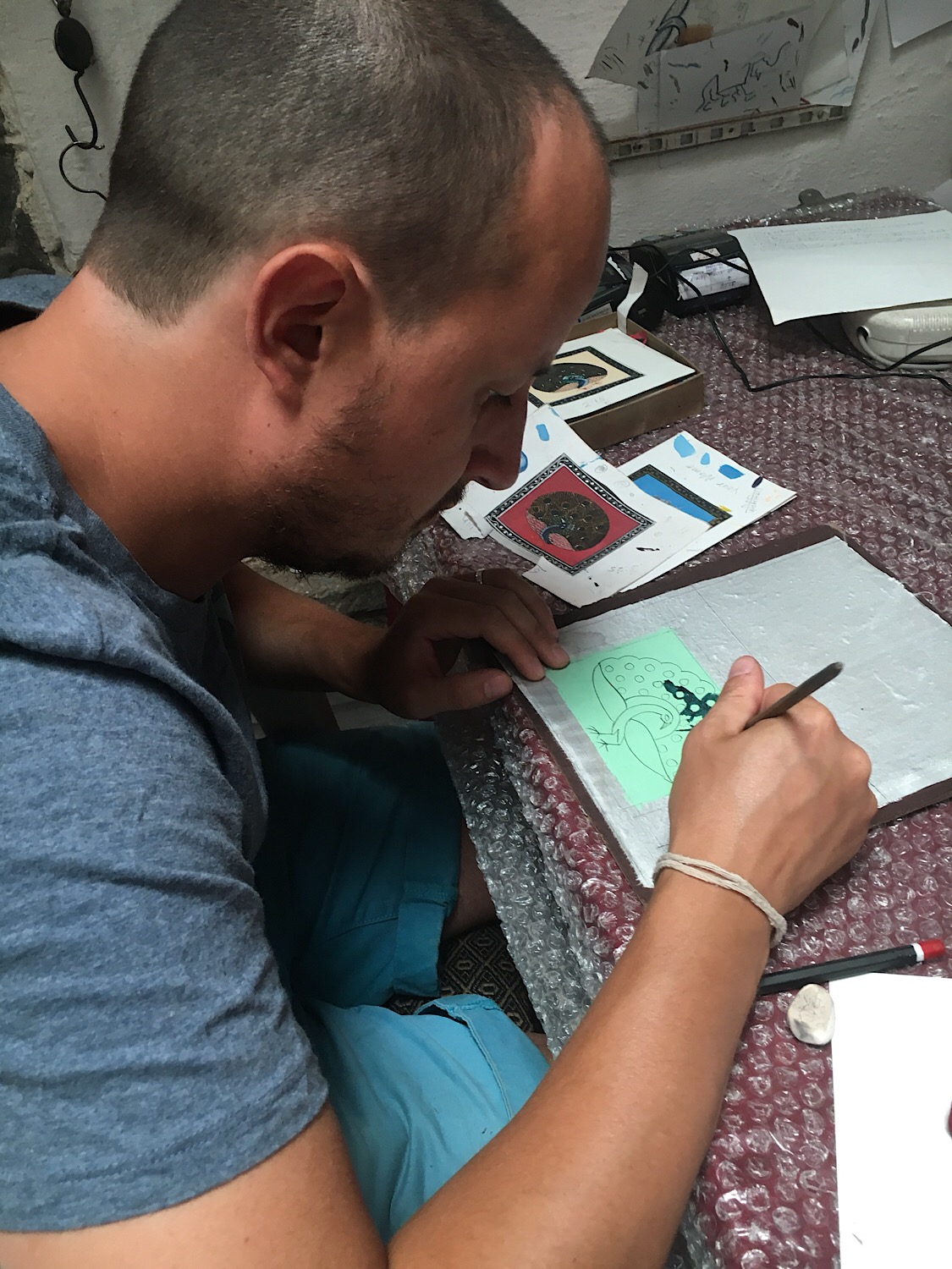 Unfortunately the huge lake that lies at the centre of Udaipur wasn’t as impressive on arrival as we’d expected as the water level is so low during summer, but it’s still a very romantic and magical place. The highlight for me was a sunset boat trip from the City Palace to Jagmandir Island (the former exclusive playground for the rich and famous Rajasthani’s) out in the middle of the lake, at dusk as we were making our way back to the shore the massive fruit bats we had seen hanging in the trees when we set off were out to feed on all the bugs that swarm at sunset. The sky was filled with thousands of the things, some with a wing span of about 70cm, it was like there were loads of big scraps of burnt paper floating around – very cool. The next day we took a miniature painting class and after four hours of sketching and painting we were both pretty happy (even Fred!) with our depictions of a tiger and a peacock.